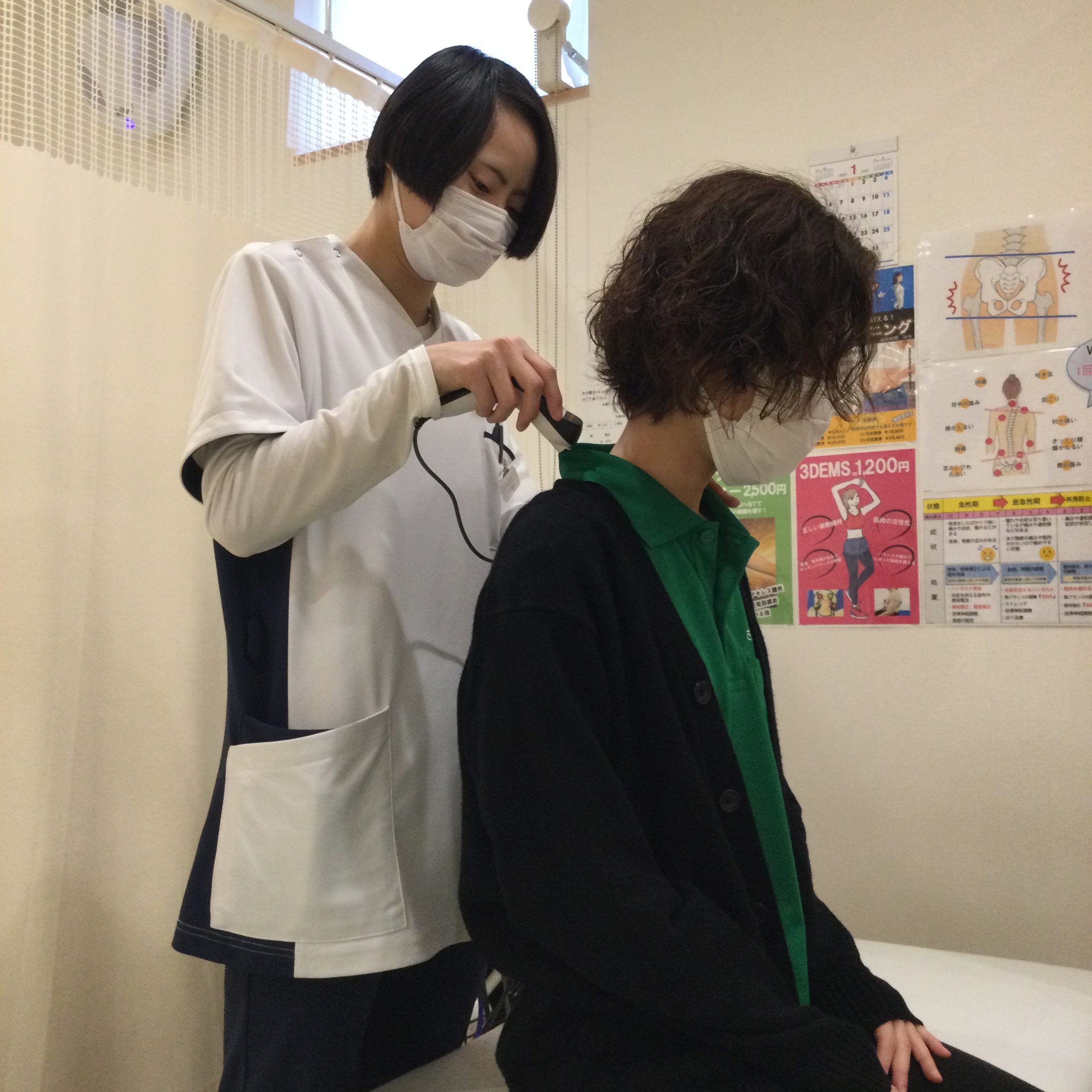 ハイボルト検査でむち打ちの原因を突き止め、電気機器で手では届かない深部のアプローチや温熱のサポートで、緊張をやわらげ、動かしやすい体へ導きます。
