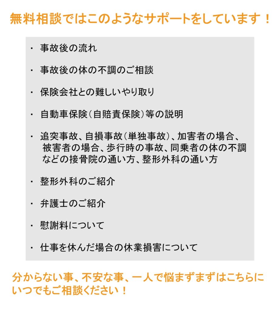 新潟市交通事故サポートセンターでは、併用の可否や進め方を一緒に整理し、必要に応じて医療機関への紹介についてもご案内しています。